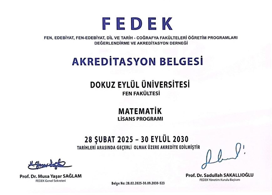 Bölümümüz 28.02.2025 – 30.09.2030 tarihleri arasında geçerli olmak üzere 5 yıllığına FEDEK akreditasyonunu almaya hak kazanmıştır.